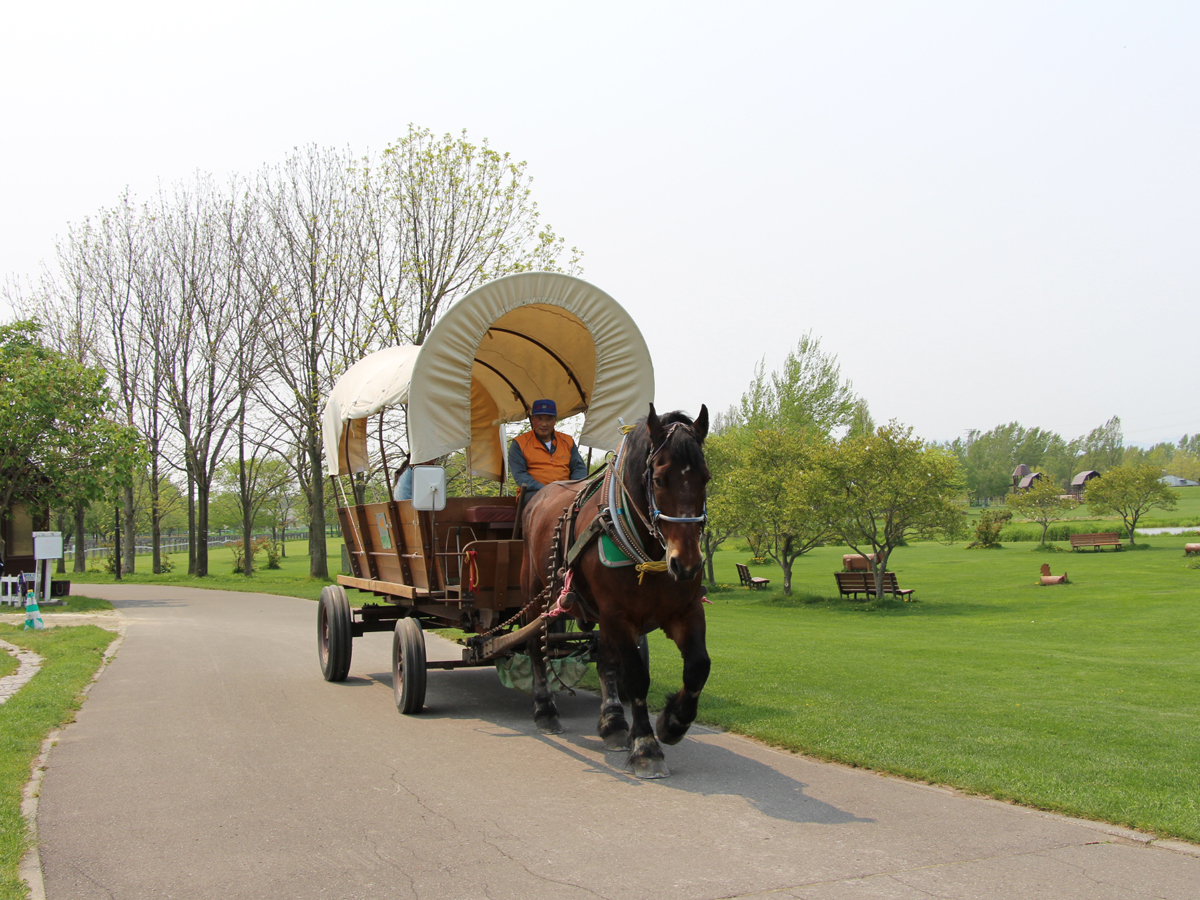 背の高いポプラ並木や白い木肌が特徴の白樺並木など、北海道外ではあまり見ることのできない自然風景も楽しめます。ふれあい広場では、羊やヤギ、ミニブタ、そして北海道ならではの農耕馬どさんこと、柵越しにふれあうことができ、直接エサをあげることもできます。炊事広場は自由にバーベキューができるエリア。利用料は無料で、炭や網、食材などは、さとらんどセンター内売店でも販売しているので、手ぶらで行ってもOKです。