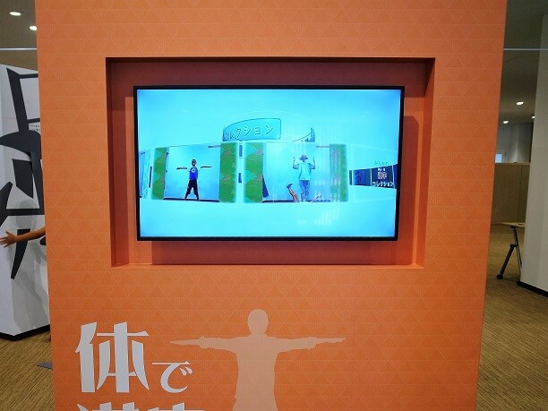 「体で漢字を作ろう」のコーナーでは、自分の体を使って漢字作りに挑戦。ひとりでもみんなと協力してもOKです!できたら撮影してモニターに登録してみよう。面白い漢字が作れるでしょうか?