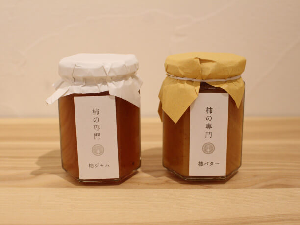 「柿バター」(600円/税抜)は、全国の地方紙で作るインターネット通販サイト「47CLUB」で全国の特産品を競う「こんなのあるんだ大賞2016」の商品部門で大賞を受賞した商品。柿の果肉を丁寧に煮詰めて、バターと合わせた商品。やさしい甘みとバターの香りが特徴です。そのまま食べると濃厚なキャラメルのような味わい。パンに塗るとバターの香りが漂います。クラッカーに乗せておつまみにも。年間を通してお土産にも大人気の商品です。また「柿ジャム」(500円/税抜)、柿をダイス状にカットしてピューレと合わせた一品。このまま食べてもパンに塗っても、ヨーグルトに入れてもおいしくいただけます。