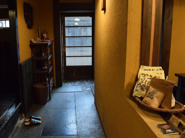 趣のある土壁、床には陶器が埋め込まれ、テーブルや椅子はオリジナルで、器は常滑の作家もの。調度類一つとってもおしゃれ感いっぱい。トータルで居心地がいい空間です。