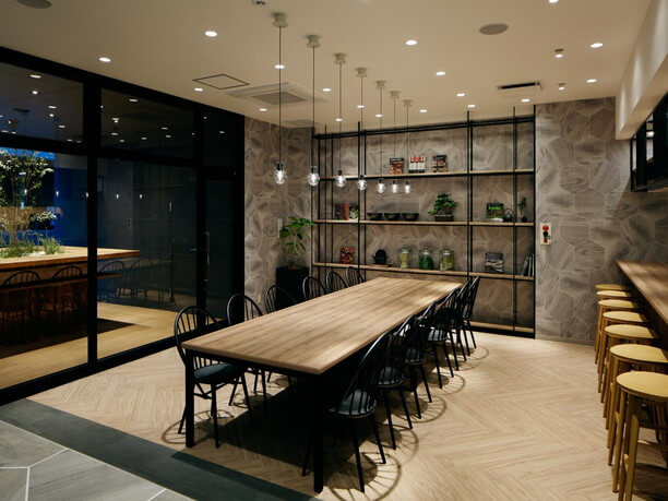 店舗の外にはウッド調のスタンディングテーブルを設置し、カウンター手前はバルスタイルのような開放感のある空間に。店舗奥にはセミ個室を設けて、従来の王将イメージからは想像もできない静かで落ち着いたスペースもあり、その日の気分やメンバーによって使い分けができるのも魅力的。従来の男性に連れて行かれる既存店とは違って、女性同士が自らアクションを起こしやすい憩いの空間に仕上がっている。