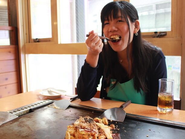 自分で焼き上げた、できたてのお好み焼きを「いただきます~!」。お皿を使わず、小さなテコでそのまま口に運ぶのが大阪流なのだとか。「あつあつ!」と言いながら、わいわい仲間と頬張るのも楽しみのひとつですね。