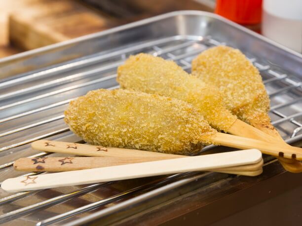 他にも鶏肉、砂ズリ、エビ、アナゴ、アスパラ、玉ねぎなど、串揚げメニューは多彩。気軽におやつ感覚で串揚げを食べることができる。立ち飲みに活用してもいいし、アルコールを飲まなくてもいい、もちろんテイクアウトも1本からOK。道路側からも入れるのを覚えておこう。