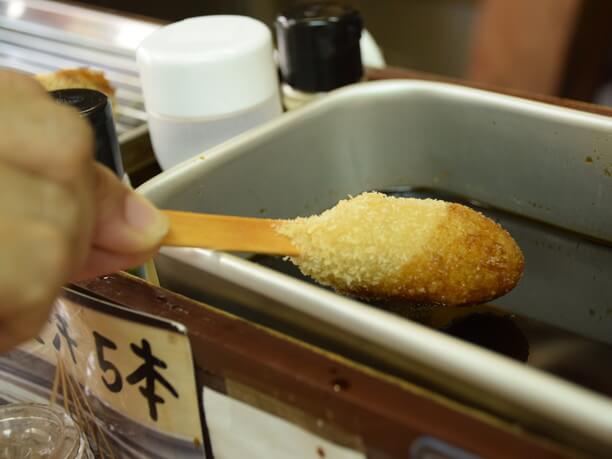 一口サイズのコロッケは、プレーン、カレー味、味噌スジ味の3種類(各60円)。食べたあと星印があれば当たり、1から3個の星の数だけコロッケがもらえる。もちろん、串カツ屋のルールは踏襲して「二度漬け禁止」だが、ツウはキャベツでソースをすくってカツにかけるのだ。