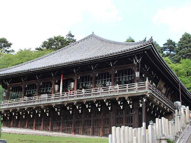 東大寺二月堂は、広い境内の東奥の高台に建つ舞台造りのお堂です。多くの燈籠が吊るされた舞台からは、奈良市街を一望でき、夕日が沈む頃には格別な眺望を望めます。