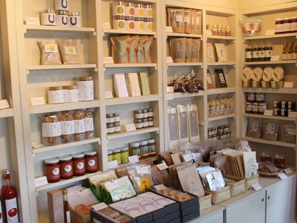 敷地内に入ったところにすぐある別棟のショップは「カージュ」です。こちらには奈良のおいしいもの、くるみの木オリジナルの商品、全国各地から集めた、日々の器、ポットや鍋などがコーナーごとに並べられています。