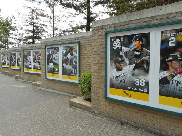 甲子園球場の敷地内に飾られている現役選手のポスターと永久欠番の選手を称えるプレート。永久欠番とは、すぐれた功績をのこした選手の背番号を欠番にする制度で、阪神タイガースでは、「10」は藤村富美男投手、「11」は村山実投手、「23」は吉田義男選手、3つの背番号が永久欠番となっている。