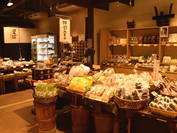 全国から取り寄せた酒肴、自社の日本酒を使ったお菓子など、品ぞろえが充実したショップ。福寿オリジナルの前掛けやTシャツなどもお土産に喜ばれそうだ。