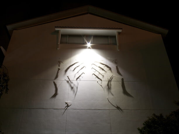 昼間は気付かないが、日が暮れると福寿蔵の外壁に浮かび上がる光と影のアートは見もの。
