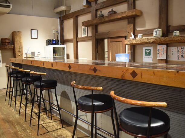 東明蔵にある喫茶カウンターで、利き酒と酒の肴を味わうことができる。日本酒が飲めない人にはお菓子とお茶のセットがあるので安心だ。(すべて有料)