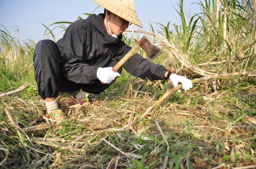根付いているサトウキビを一回で切るのは意外に難しい。