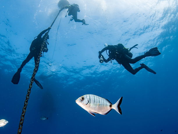 2日目の最初は1日目のおさらいをしますが、沖まで出ているのでもちろん足は着きません。海底まで伸びたロープを伝って深くまで潜っていきます。