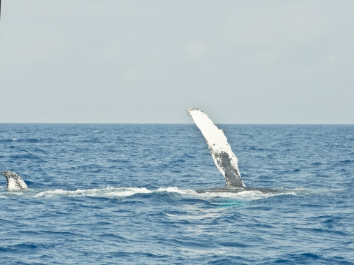 遥か遠くの波間にスッと白く伸びたクジラの手!