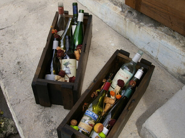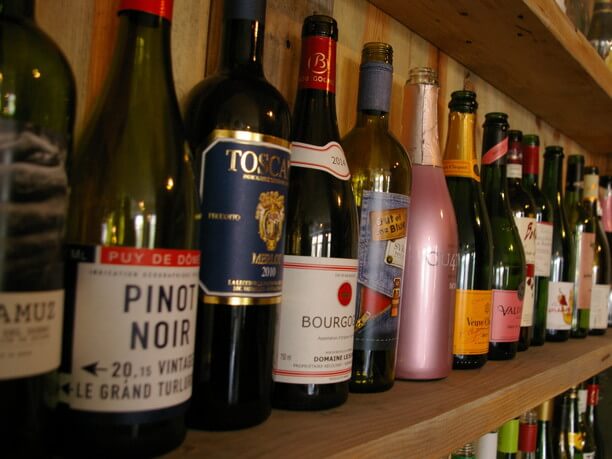 小さな看板がありますが、その周りに飾られているワインボトルの方が目立ちます。これを目印にお店を探してみてください。