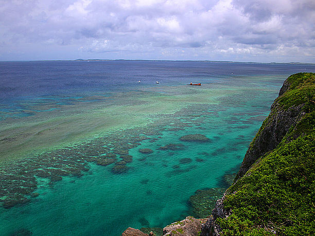 鮮やかに輝くエメラルド色の海と深い青色との海の間には