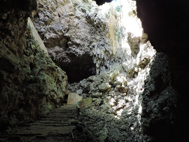 サダさんによると、ここはインギャーマリンガーデンとつながっており、潮の満ち引きで水の深さが違っていたそうです。「いつも友達と助け合いながら水を汲み合ったさあ」とお話しくださいました。幼い少女が膝まづき、手探りで、勘を頼り、友達と助け合いながら水を汲み、家路に向かう、そんな毎日を想像しながら振り返った時、洞窟の入り口から降り注ぐ光によって足元の階段の所々が光っているのに気づきました。