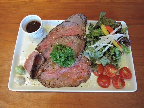 鎌倉ハンバーグ同様に、黒毛和牛100%の肉厚ローストビーフ。贅沢にスライスされているため、しっかりとした歯ごたえがあり食事としても満足感を得ることのできるボリュームが自慢。自家製のソースにワサビ、ホースラディッシュをお好みで。このローストビーフを目当てに来店されるお客さまも少なくないとのこと。