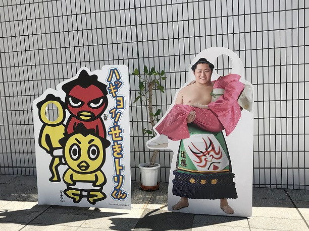 入口には力士と記念撮影できる顔出しパネルもありますよ。